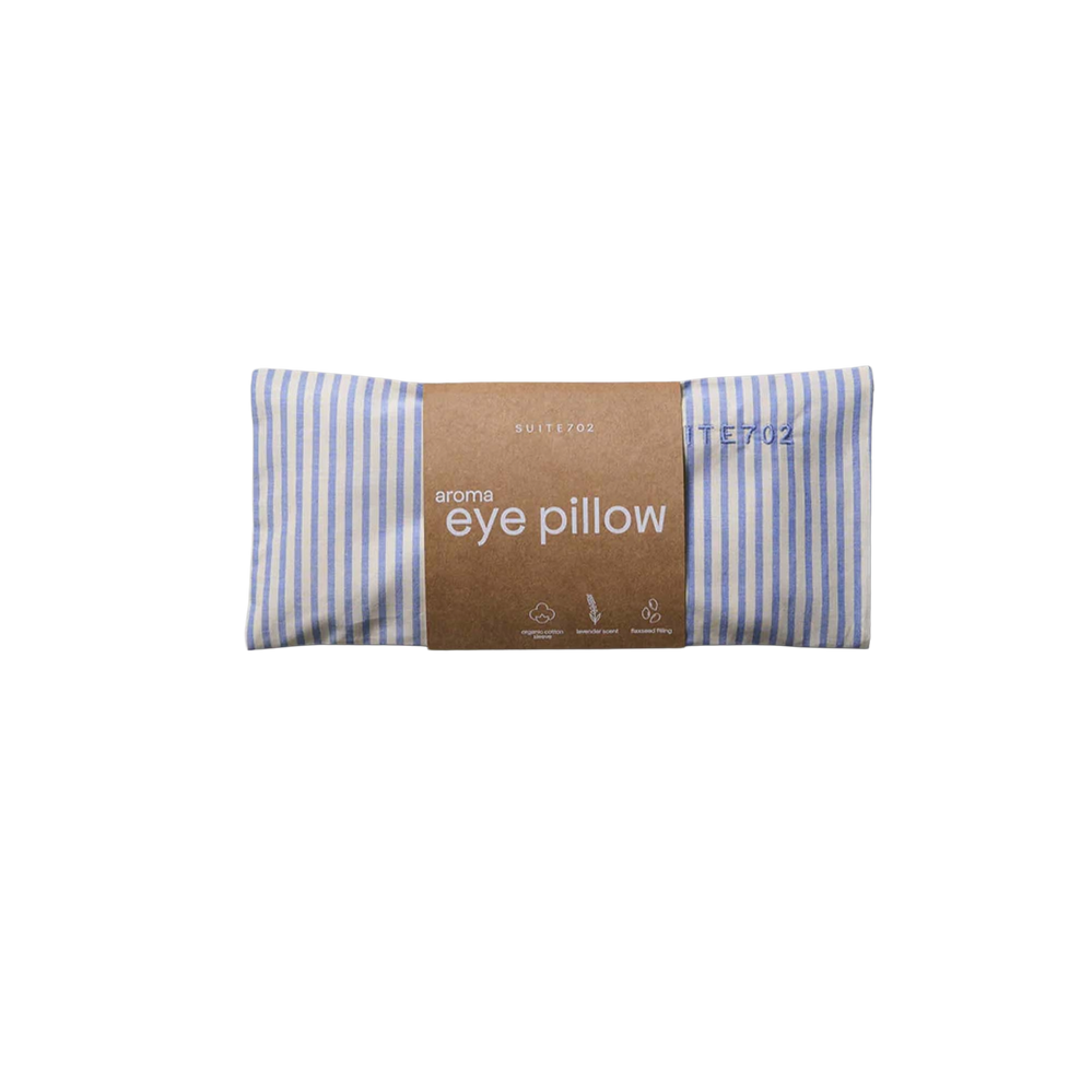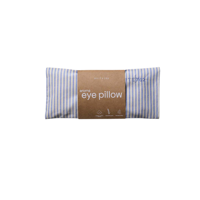 وسائد العيون العطرية مصنوعة من قطن بيركال مخطط عضوي، ومملوءة بمزيج من بذور الكتان والخزامى.