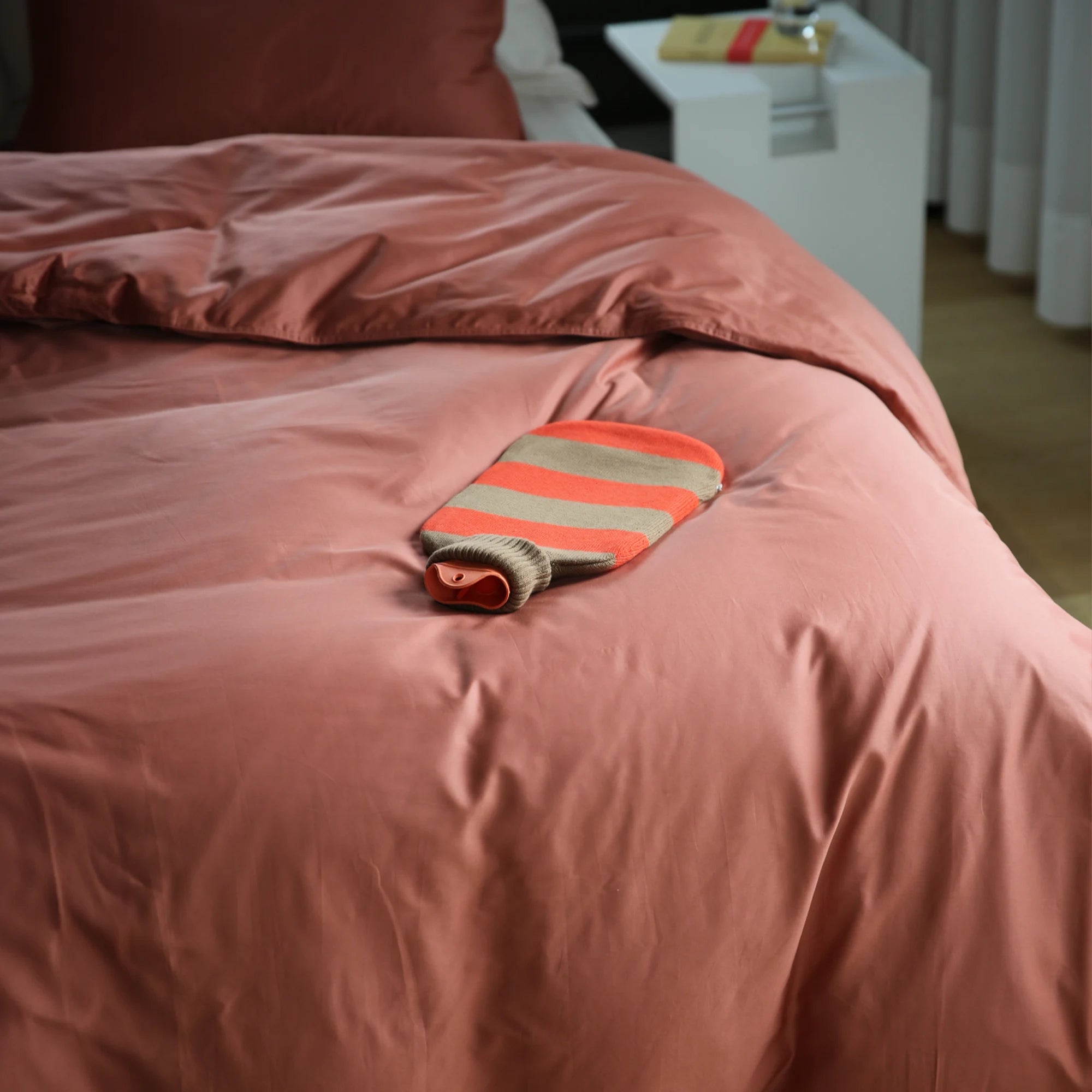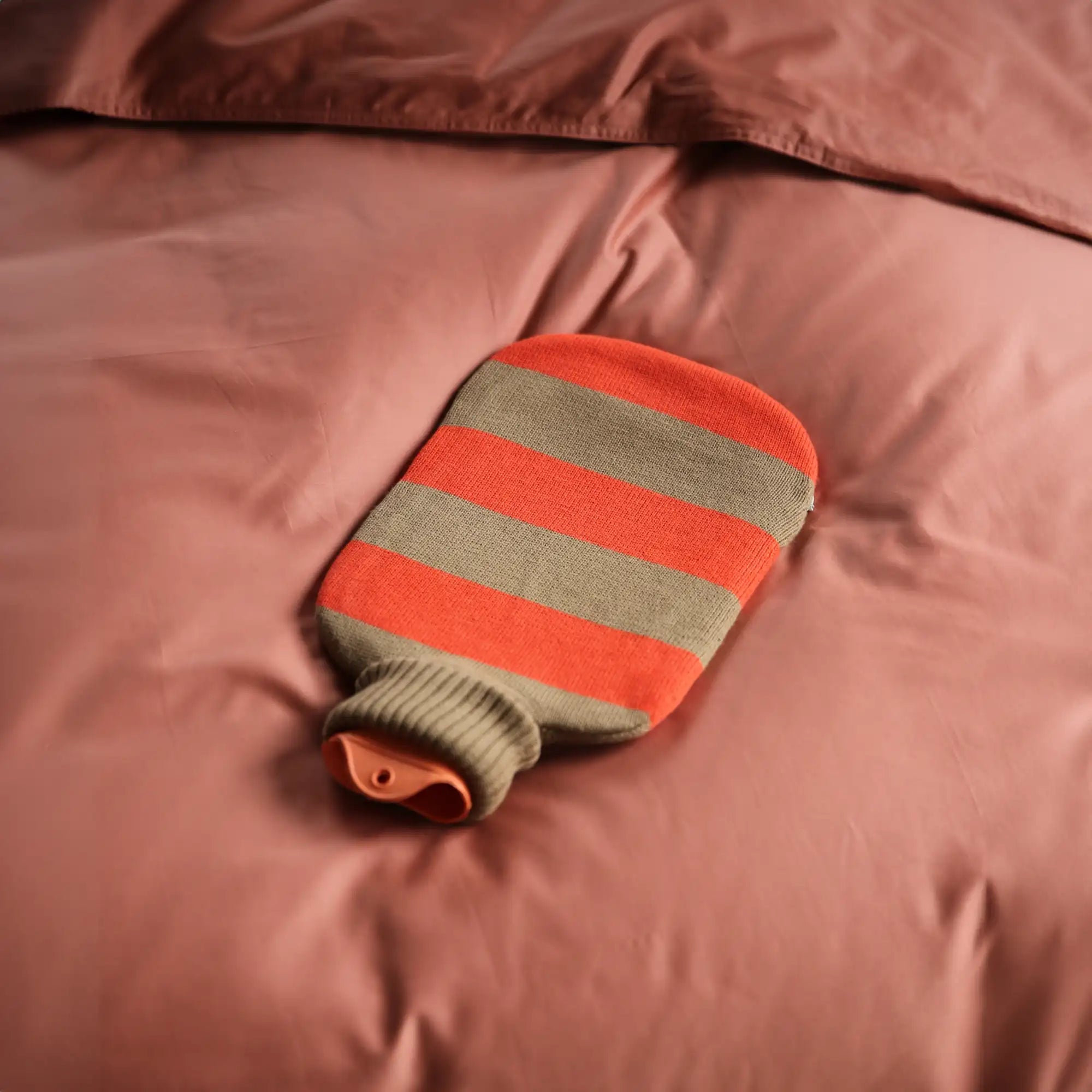 قارورة الماء الساخن مصنوعة من مطاط اللاتكس الطبيعي، ومزينة بغطاء مخطط مصنوع من القطن العضوي. الغطاء المحبوك ناعم بشكل فاخر وغير مهيج للبشرة. تتنوع الألوان بشكل أنيق وتتناغم مع أثاث الأسرة والأرائك.