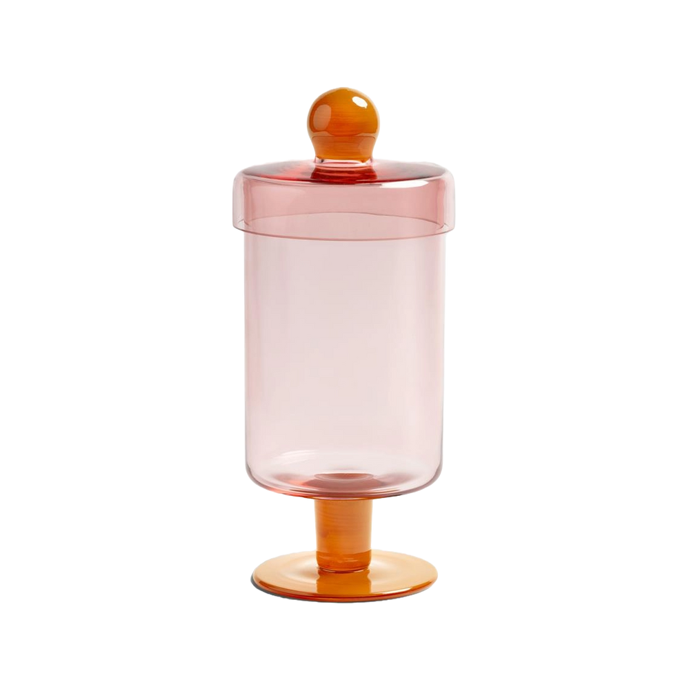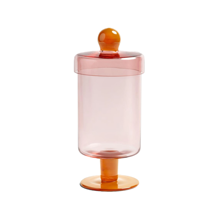 كلاسيكي ملون مع لمسة جديدة. توسعت سلسلة جرة ثنائية المحبوبة الآن بإصدارات طويلة جديدة بثلاثة أحجام وألوان محدثة للحجم الحالي. مصنوعة من زجاج الصودا ومغطاة بطبقة رذاذ دقيقة، تتميز كل جرة بمقبض وقاعدة مرسومين يدويًا. مثالية لتخزين الحلويات أو الفواكه، أو كقطعة ديكور جذابة في مطبخك.
