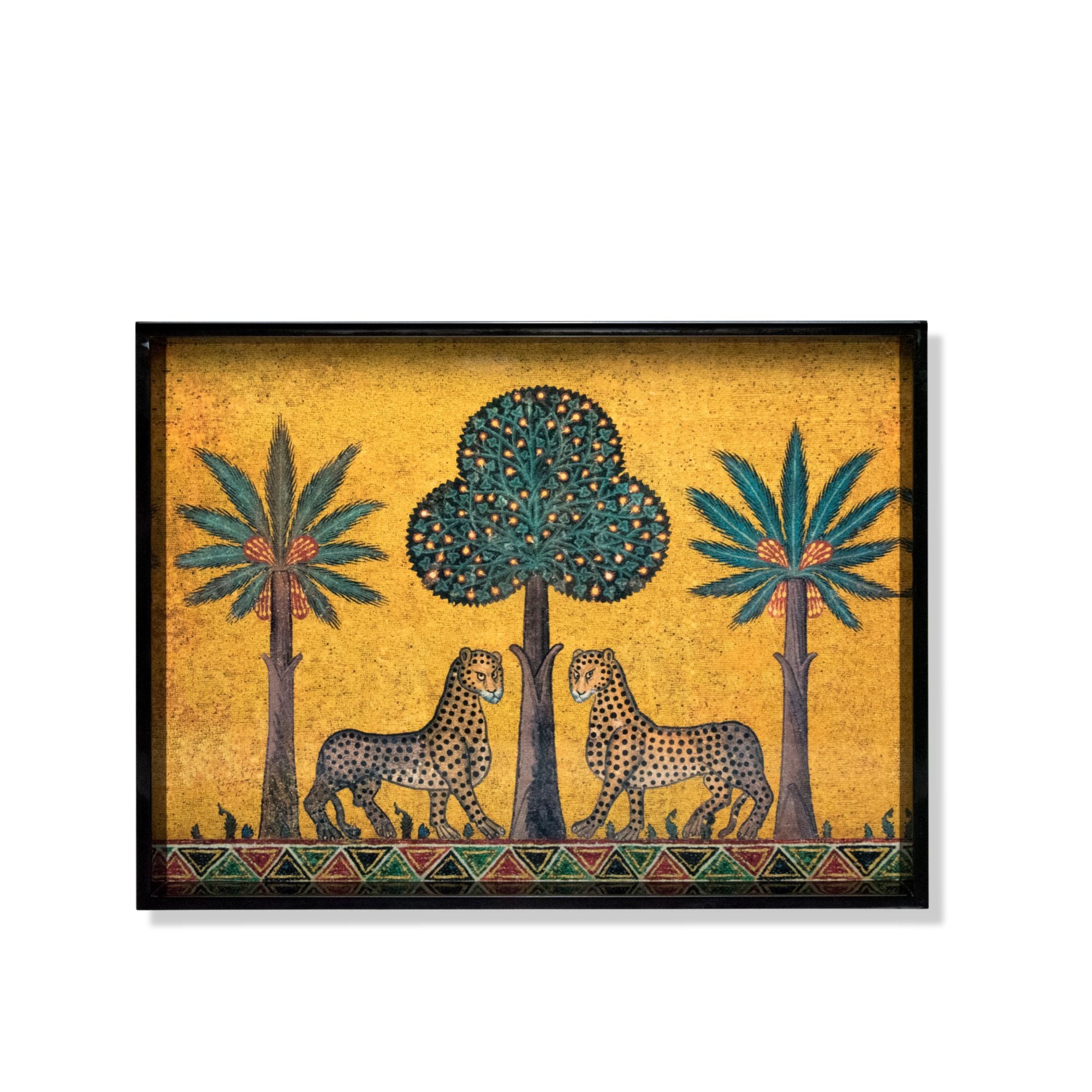 هذه الصينية المطلية باللكر المصنوعة يدويًّا مثالية لتقديم الشاي أو المشروبات أو الحلوى. الجسد المرسوم على الصينية هي صورة للمخلوق المهيب المعروف باسم il gattopardo، أو النمر، و هو جوهر الثقافة الصقلية لعدة قرون.