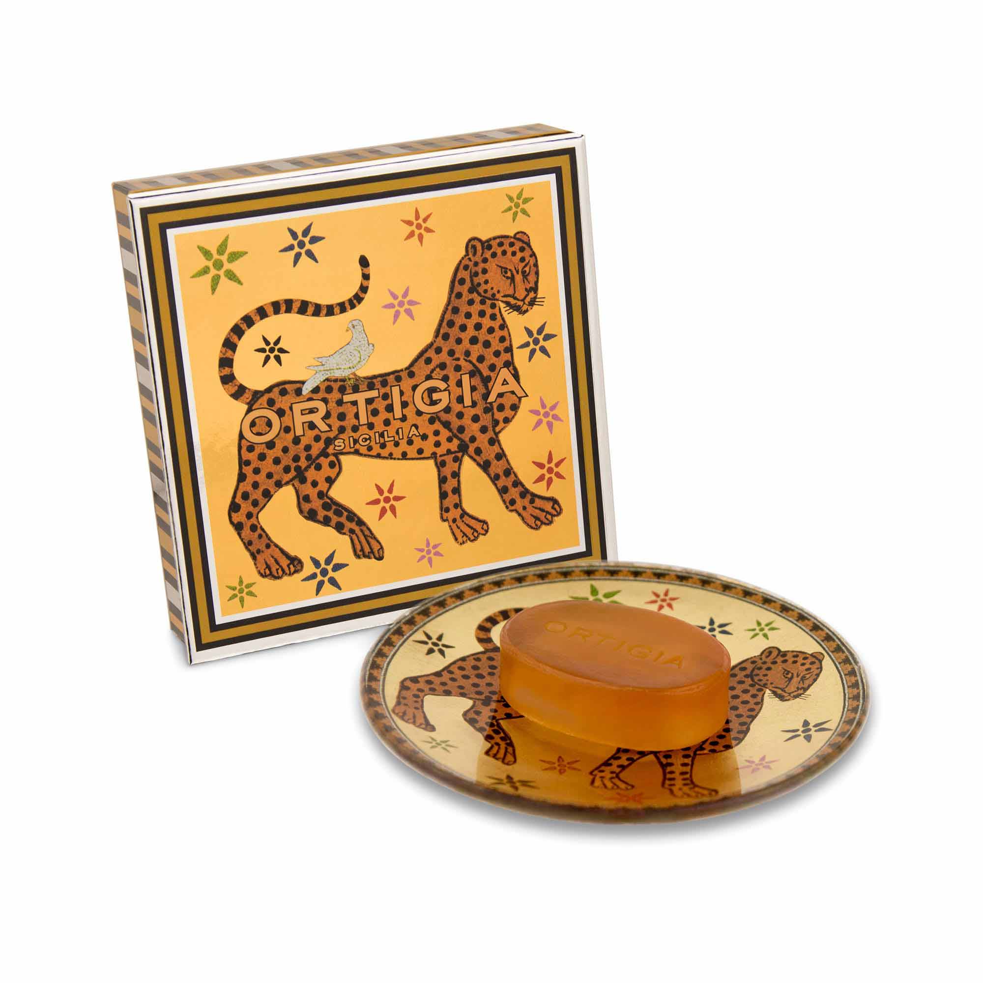 Ambra Nera glycerine soap (40g) presented on a glass plate with Ortigia serigraphed printing.