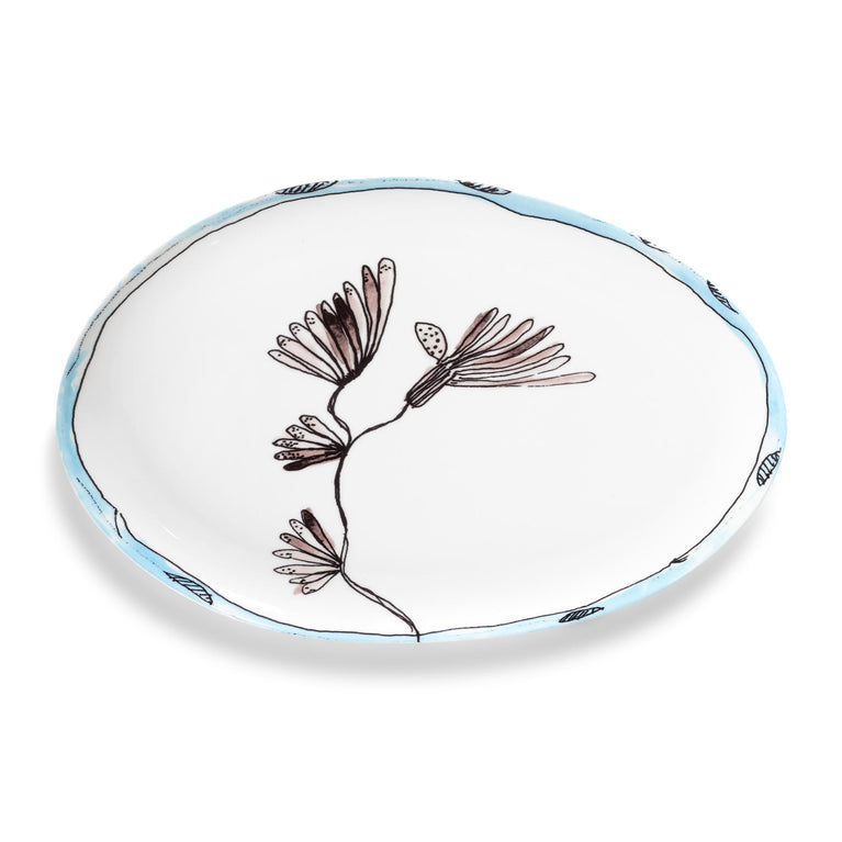 The light blue organic rim creates an exciting contrast, giving this plate a charming, handmade look. This plate's variety of illustrations, colours and shapes allows you to create your unique table style effortlessly.