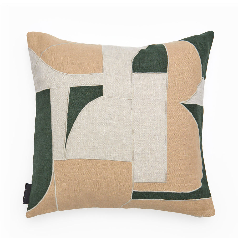 This 100% linen cushion cover features a tactile patchwork of abstract shapes in warm neutrals and fern green. Our Caroe embroidered patchwork cushion cover is part of our Natures Shadow collection for Autumn Winter 2023, an exploration into nature, community and craft as the life affirming things which connect us.