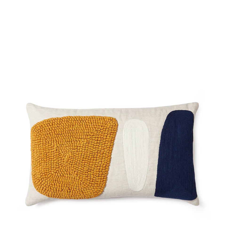 Crafted from 100% cotton (exclusive of textile decoration) with a 100% linen base, this cushion cover features a striking color-blocked design adorned with intricate crewel and knotting embroidery details.