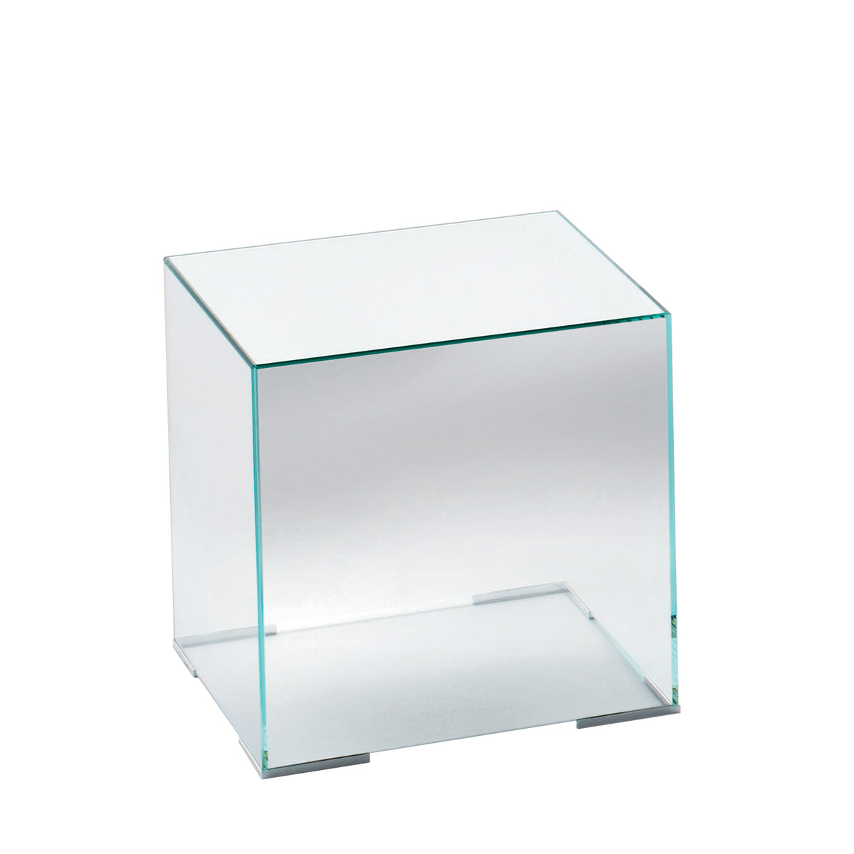 Series of parallelepiped shaped low tables with mirroring top and degrading shading mirroring sides. Realized in extralight glass, glued 45°.