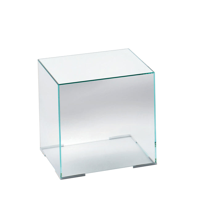 The Illusion Side Table Plinth, crafted in Italy, is designed with extra-light glass. Its dimensions are 39 cm in length, 39 cm in depth, and 80 cm in height.