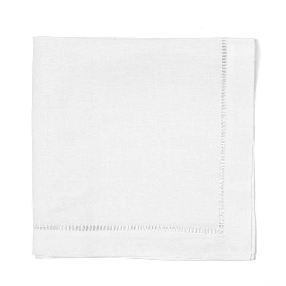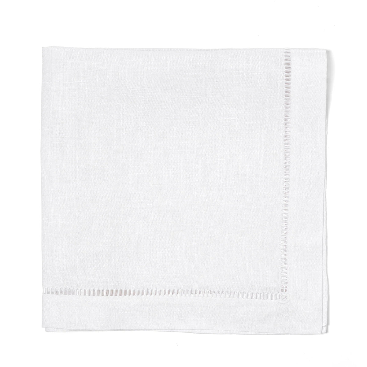 The crisp white fabric is accented by a a hand-sewn hemstitch border, available in four colours to complement any table setting.