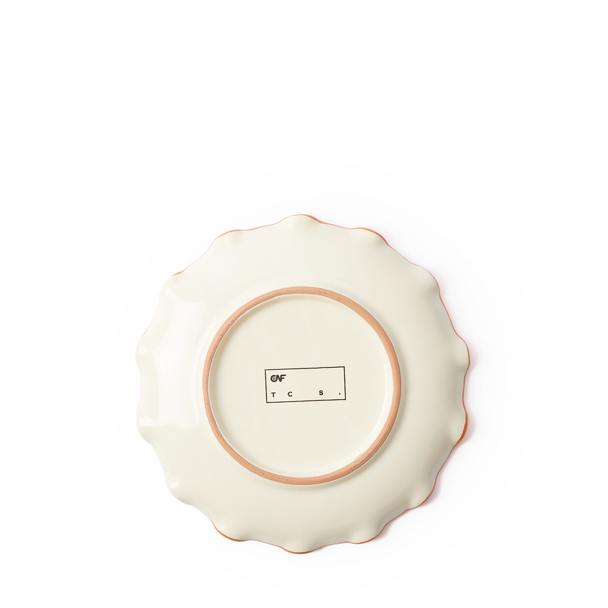 Finished with a pretty, waved edge which is accented with hand painted stripes in a warm apricot shade this piece is designed to elevate an afternoon snack or show off your latest culinary work.