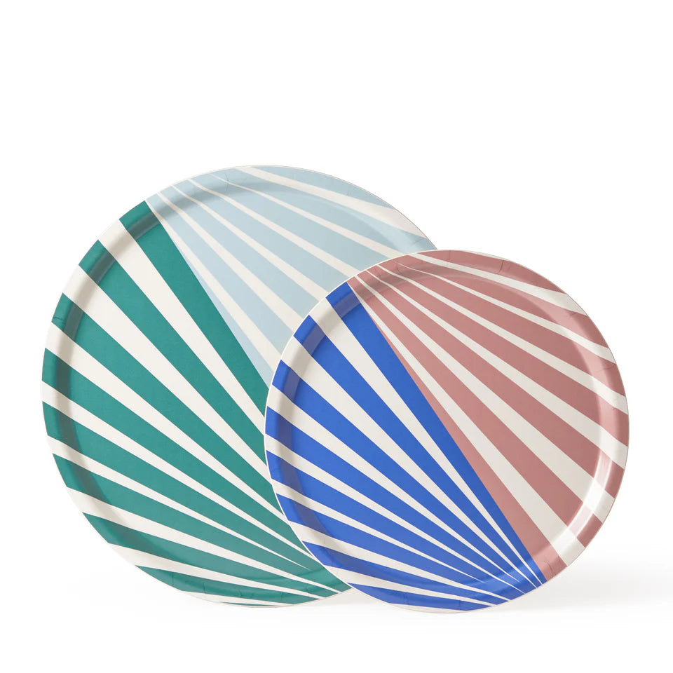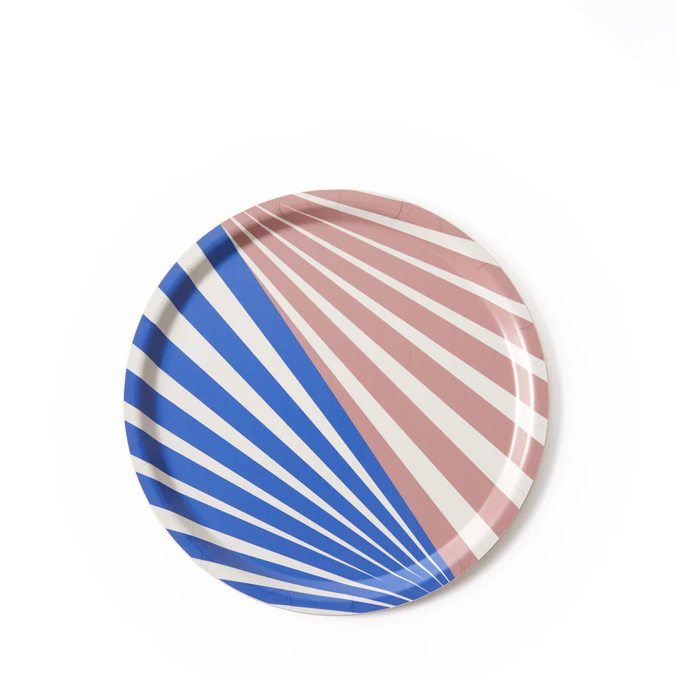 The diagonal striped pattern is mirrored on either half of the tray in a refreshing colour palette of white, soft pink and pale blue. With a smooth satin finish this round tray is perfect for styling around the home or for serving breakfast in bed.