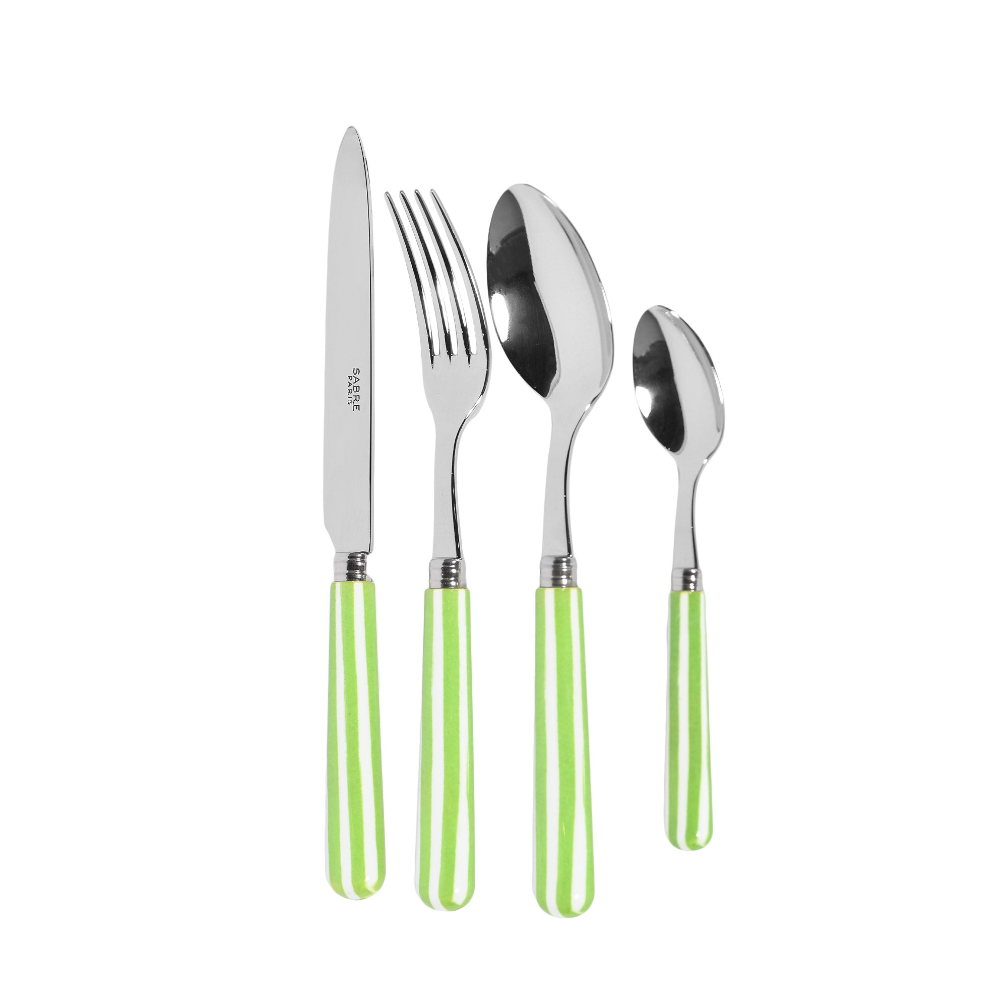 The Sabre 4-piece sets are comprised of a soup spoon, a dinner fork, a dinner knife and a teaspoon.