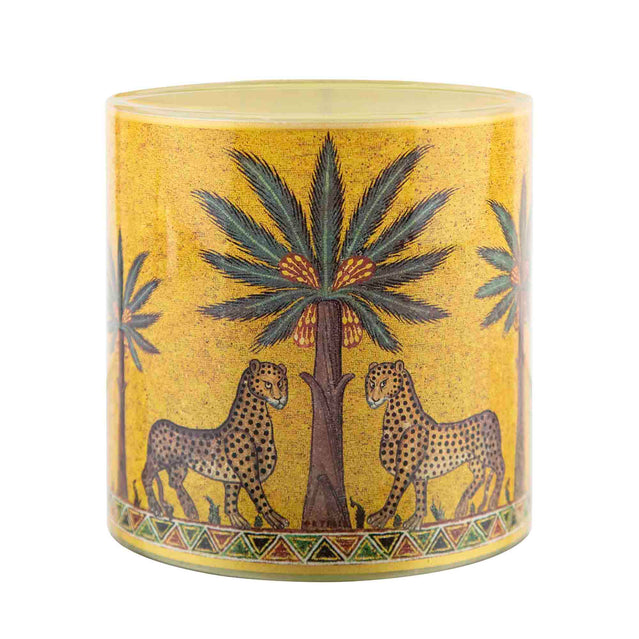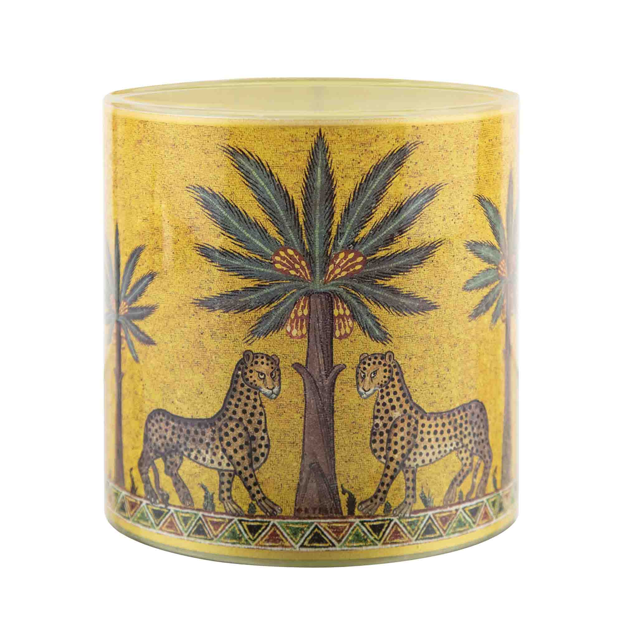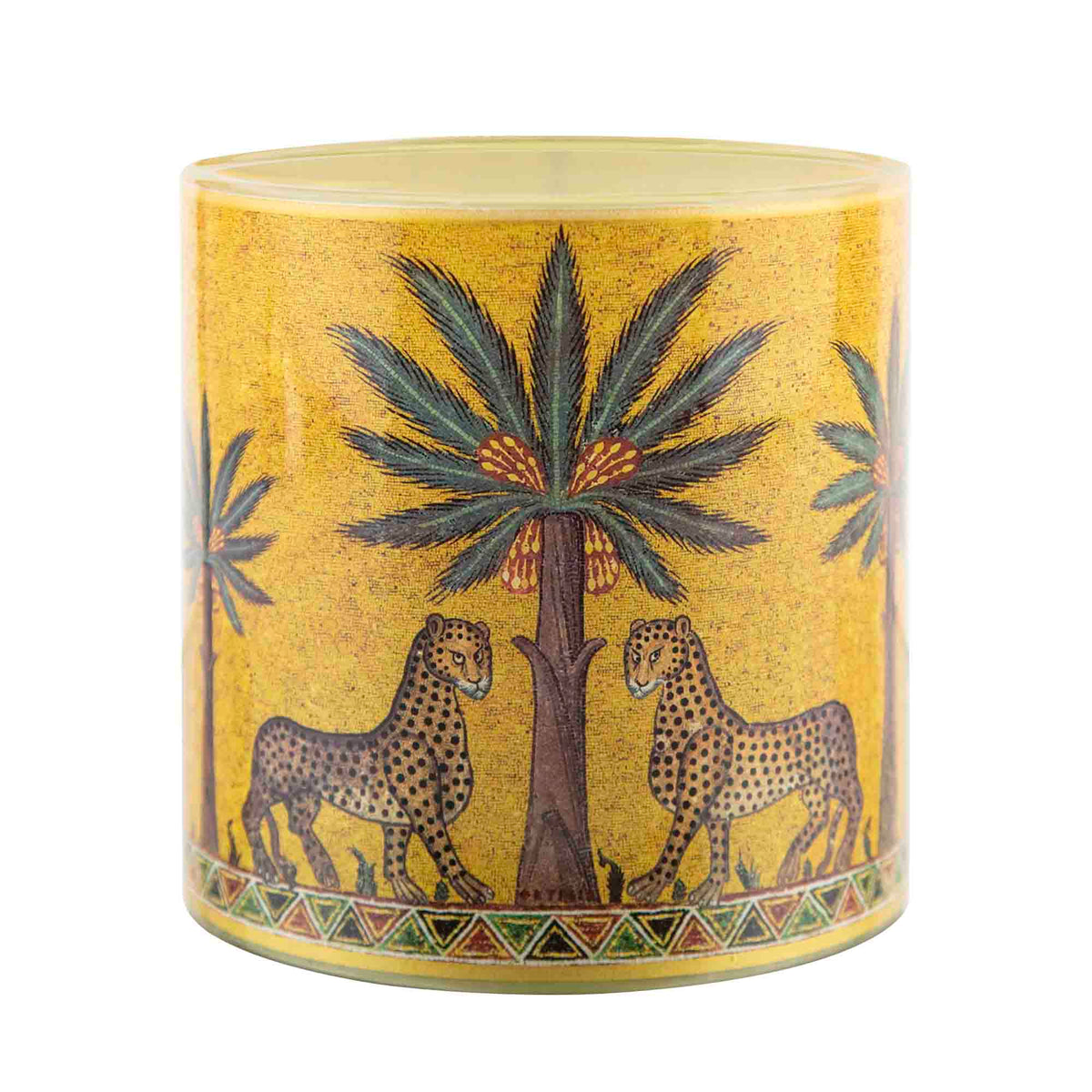 A decorated glass candle jar of lush golden wax, rich with the natural essences of orange blossom and fragrant wood. With handmade gold foil details, the print creates a stunning effect as it burns.